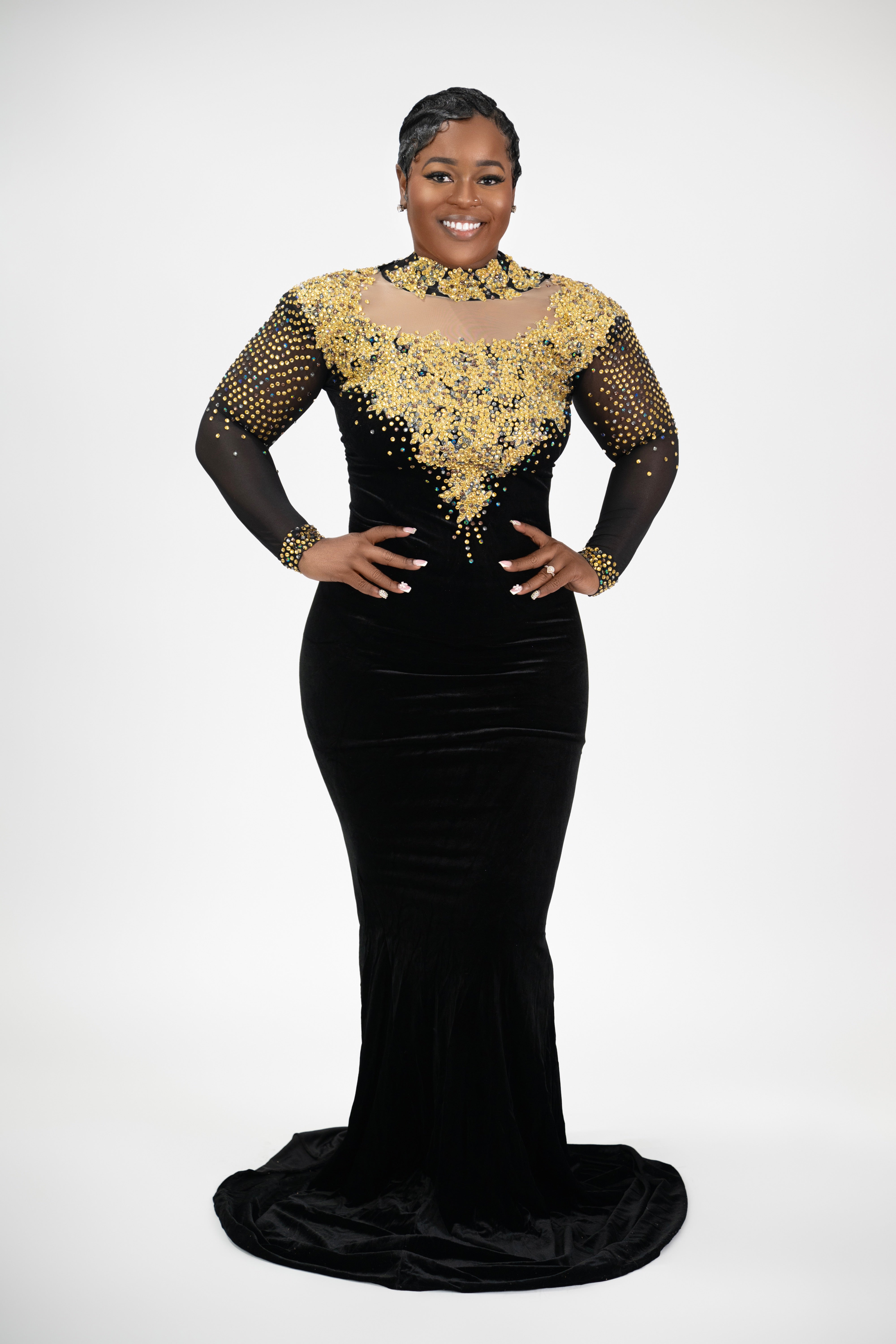 Elegant long sleeve black and gold empress gown is a stunning velvet statement piece with sheer sleeves embellished with gems gold encrusted high neck line body hugging silhouette stretch fabric this empress gown with have you turning heads, perfect for special occasions like wedding parties birthdays